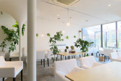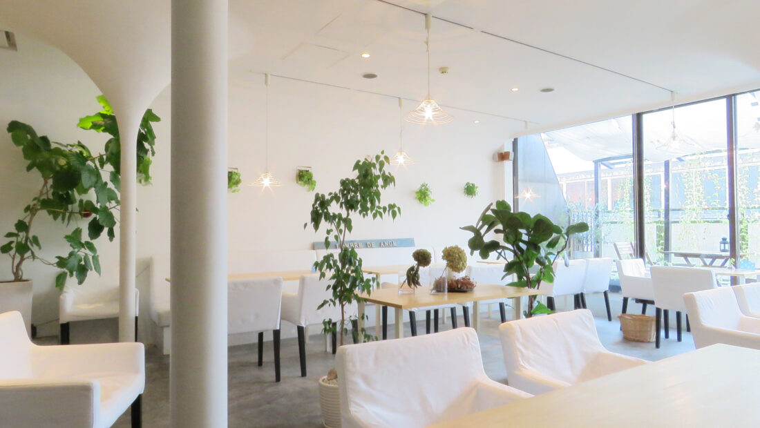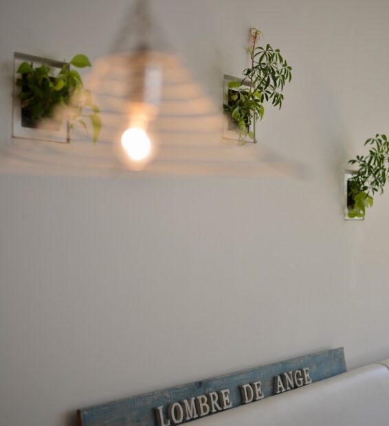 l’ombre de angeとは、フランス語で天使の影という意味。白を基調とした店内は落ち着いた雰囲気です。昼間は太陽の光が差し込み、夜にはダウンライトのおしゃれな雰囲気になります。